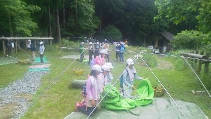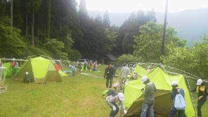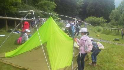 班の仲間と協力してテントを立てています。しっかり立てないと今夜寝る場所がありません。みんな、なかなか上手です。
