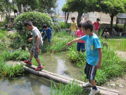 土曜日に「おやじの会」のみなさんに新しく架け替えてもらったビオトープの池の橋です。今日は、低学年の子どもたちが、早速そぉーっとそぉーっと気を付けて渡っていました。また、すぐに慣れるでしょうが、それまでは、気をつけないといけませんね。さすがです。