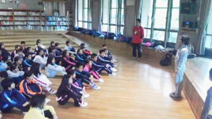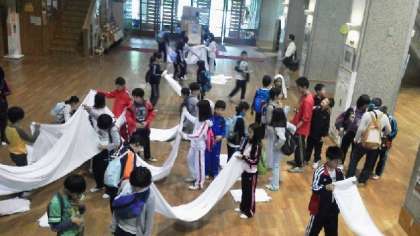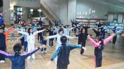 写真はシーツたたみに悪戦苦闘。朝の集いでのラジオ体操…。