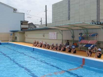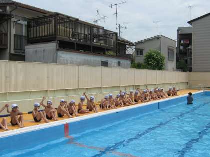 安全に気をつけていく上で,バディの大切さを子どもたちにも意識づけています。準備運動をしてから,プールサイドで学習の中身を知った時にバディー。学習の途中でのお互いの顔色を点検するためにバディー。そして後半にもバディーで確認します。