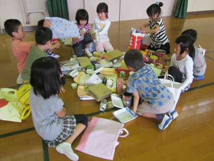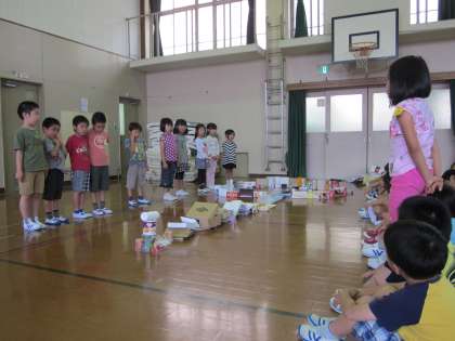 1組のきりんグループは,「お城」を作りました。みんなで持ちよった材料からすぐに取り組んでいました。お風呂やトイレもあり,なんと,外湯もありました。1組と2組で交流をしました。工夫したところや頑張ったところを次々に発表する姿は,かっこよかったです。