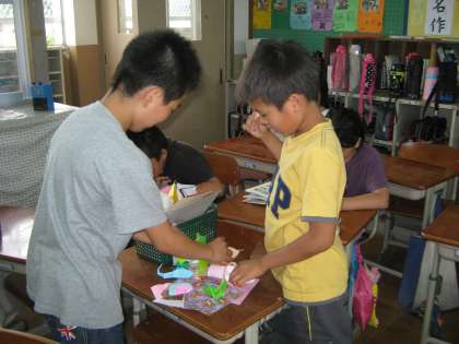 1枚目の写真は,「おりがみ」です。飾りや動物の折り方を教え合っているほほえましい姿がありました。