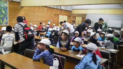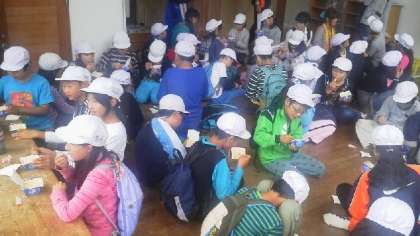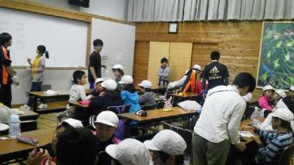 午後も雨バージョンです。山頂で食べるはずだったおにぎり弁当を大食堂で食べた後、室内ゲームを楽しみました。写真は学生ボランティアの若者たちが『都道府県ビンゴ』をしているところです