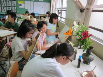 教室に、たくさんの花瓶と美しい花が用意されました。子どもたちは、自分で描こうと思う花のところに行き、わりばしペンで描きました。