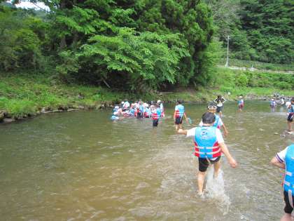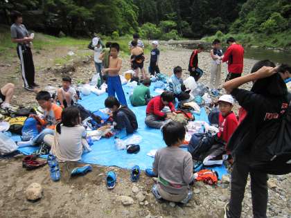川の活動の最後には、ボートが登場しました。みんなで川上まで引っ張り、自然に流されていくのは、気持ちよさそうでした。河原で着替えて、すぐにお弁当です。
