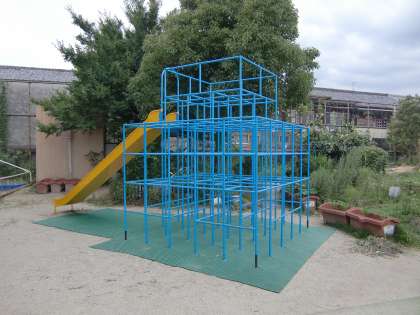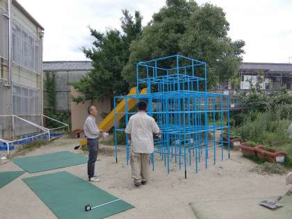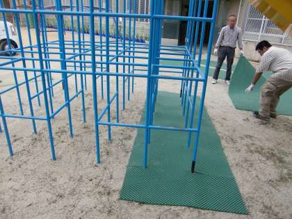 低学年用のジャングルジムの足元にようやく安全マットを敷くことができました。