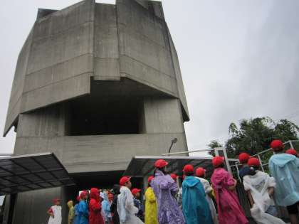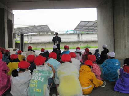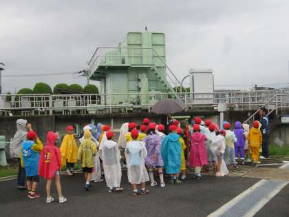 あいにくの天気になりましたが、4年生は松ヶ崎浄水場へ社会見学に行ってきました。大きな、濾過するための砂を洗う水をためておく建物から見学がスタートしました。