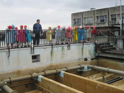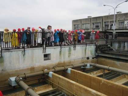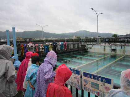 水を濾過する時につかった砂を2日に1度洗うそうです。その時の様子を見せてもらいました。砂の下から水が出てきて、かき混ぜられると一気に水が真っ黒に。どんどん汚い水が流されていき、すーっと、きれいな水になり元の様子に戻っていきました。子どもたちも、水の勢いや汚れの色に驚いていました。