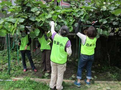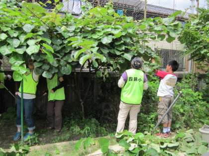最初は、環境委員会の子どもたちも手伝ってくれました。その後は、みんなで、オスの枝かメスの枝かを確かめながら伐っていきました。また、フェンスを越えて、お隣に延びていきそうなものは、オスメス関係なく、ばっさりと伐りました。風通しもよくなり、日も当たるようになりました。今年は、キウイの実がいくつできるか楽しみです。
