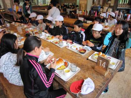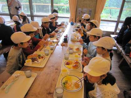 朝のお楽しみは、やっぱりバイキング。自分の好きなものをいただきます。でも、子どもたちのお皿を見ると、なかなか考えているのです。栄養のバランスを。野菜もしっかり食べている子がたくさんいました。「よりよく生きるために、考えて行動」しています。