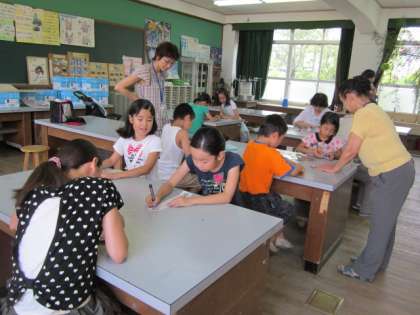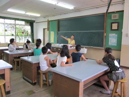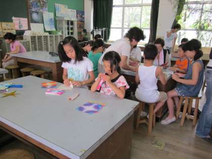 今日のサタデースクールは、地域の方を講師に「七夕かざりをつくろう!」を行いました。地域の方にいただいた笹を理科室におき、きれいなかざりや短冊をつけていきました。