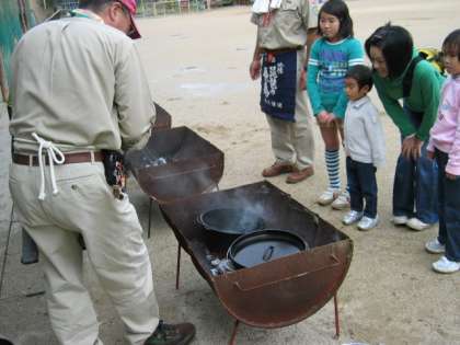 かなりの高温で,ダッチオーブンにサラダオイルを塗ると,白い煙が立ち上り,見ていた子どもから,「綿あめをつくるときみたいな煙や!」という声が聞こえてきました。