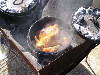スタッフドチキン(鳥の丸焼き・中にピラフなどをつめてある)が,出来上がりました。