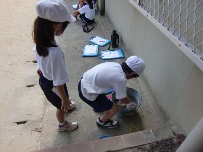 雑巾を水でぬらして鉄棒の熱を取っています。工夫する2年生,なかなかかっこいいと思います。