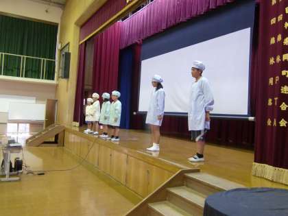 贈呈式の後,モデルの子が新しい給食の服を着てステージに登場しました。