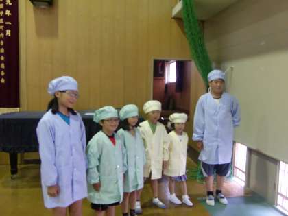 低学年は薄いクリーム色,中学年は薄いグリーン,高学年は薄いブルーと色で分けてあります。夏休み明けから,この服装で給食当番の仕事に励みます。