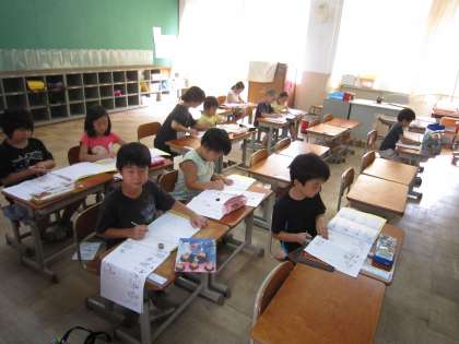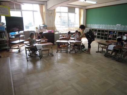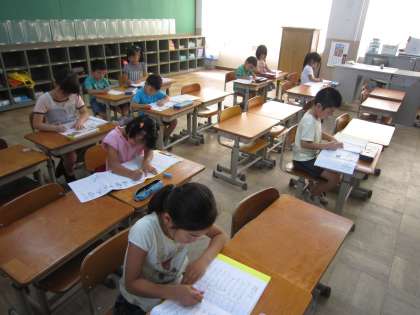 1年生の夏学習。静かに、集中して学習していました。姿勢もばっちりの子どもたちがいっぱいです。2年生も、自分の課題に自分でどんどん取り組んで頑張っていました。分からないところは、先生に教わりながら、大切に時間を使っています。