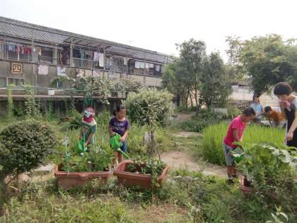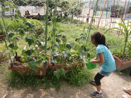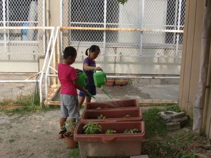 2年生の子が水やりをしています。当番を決めてしているんだと思います。自分たちが育てているオクラやキュウリやエダマメなどに丁寧に水をやっていました。