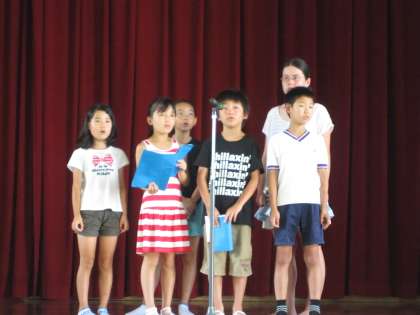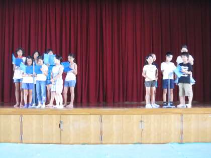 子ども音楽隊のリハーサルは、「こきりこ節」「オーソレ・ミオ」「カントリー ロード」の三曲を歌いました。練習しているうちにだんだん声が出てきました。本番では、もっと声が出るでしょう。