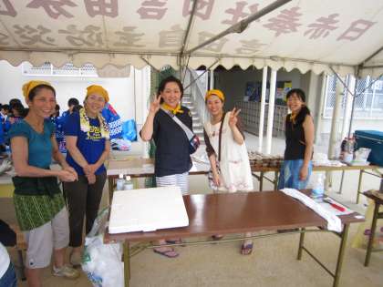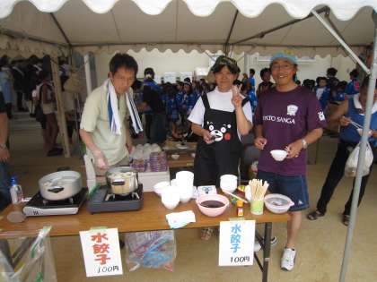 学童クラブ保護者の「焼きそば」。学童保護者OB会の「水ギョーザ」。PTA役員OBとおやじの会の「かき氷」。みなさんすてきな笑顔です。