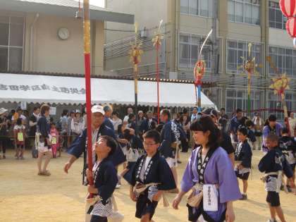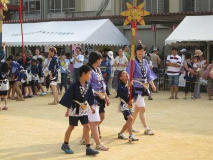 大人の剣鉾に引き続いて、子どもたちも剣鉾をさして、リズムよく腰を落としながら足を進めました。こんなに大勢の中でのお披露目は、初めての子どもたちもいます。それでも普段通りにがんばりました。