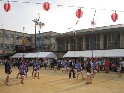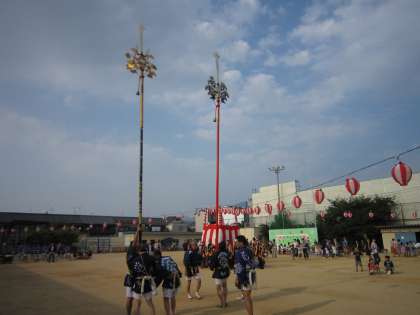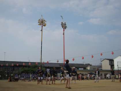 毎年、剣鉾の雄姿を見せてくださっている剣鉾保存会の皆さんが、今年もかっこいい伝統の技を見せてくださいました。女子大学の学生の皆さんも年を追うごとに人数が増えているようです。この後、子どもたちが、がんばりました。