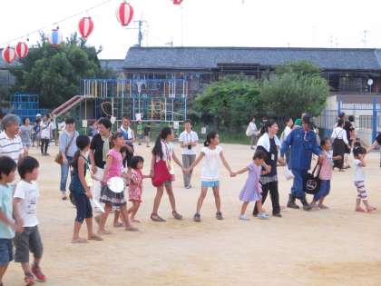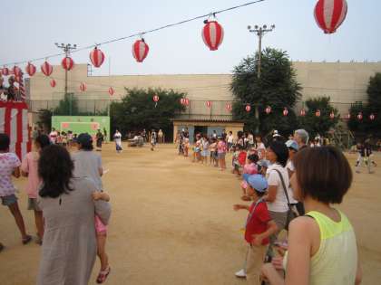夏まつりの終わりは、やぐらの周りを盆踊り、マイムマイム。今年は、盆踊りの参加がすこし少なく感じました。けれども、マイムマイムになると、子どもたちがたくさん参加し、元気に踊り出しました。最後は、明るく終われてよかったと思います。