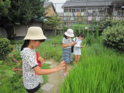 5年生の女の子3人が、イネの観察をしに、ビオトープにやってきました。京大の先生が育てておられる京大のお米は、もう稲穂がなっているので、自分の育てているイネはどうかなと思ったそうです。