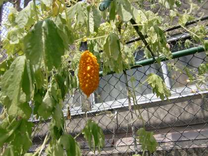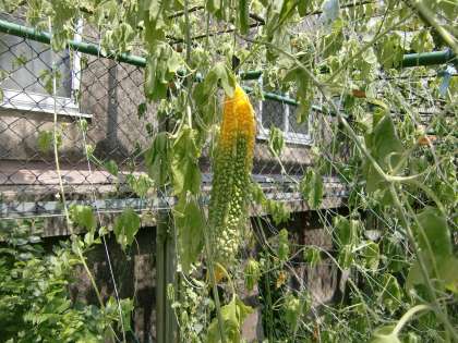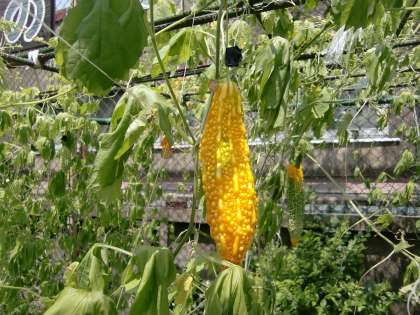 四錦の4年生が育てているツルレイシがようやく黄色くなり,赤味も帯びてきました。