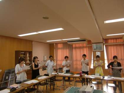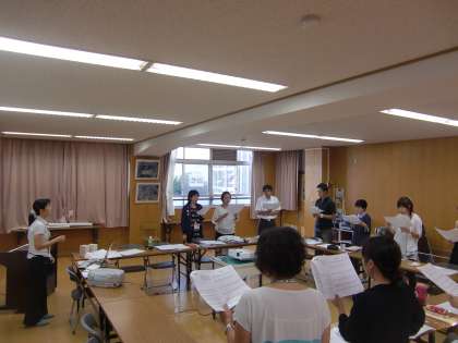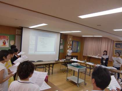 それに続いて,音楽の研修会を行いました。写真はみんなで歌唱練習をしているところです。(私には)腹式呼吸はなかなか難しいです。