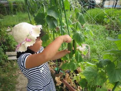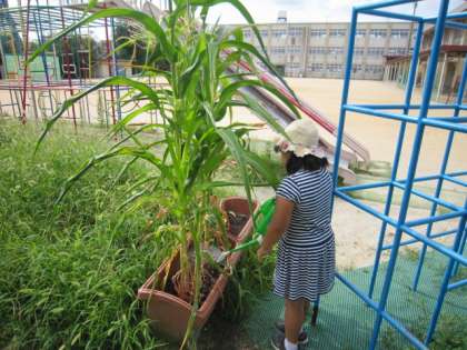 少し前までは育っていなかったトウモロコシの実も、次第に大きくなってきています。きゅうりは、大きいのが2本できていました。当番の活動を忘れずにしてくれて、とてもうれしかったです。