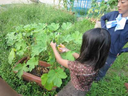 毎日毎日、2年生の子どもたちが野菜の水やりに来てくれます。きっと、野菜を大切に思っている心と、自分の役割を果たそうとする気持ちの表れだと思います。とってもまじめでかっこいいと思います。