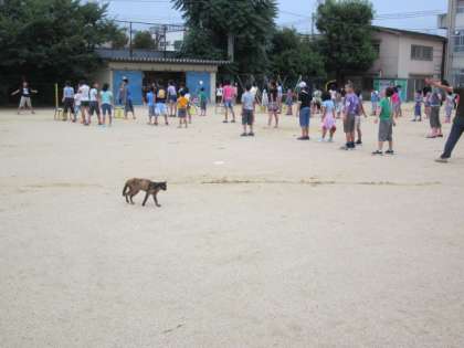 下の写真は、体操中になぜか、人の間をのんびりと歩いてきたネコです。