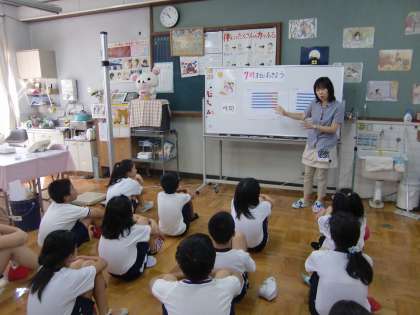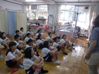 この身体計測に先だって行われるのが,養護の吉川先生によるミニ学習『なぜ,7時までに起きるの?』です。