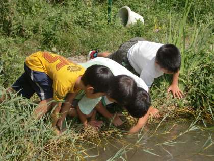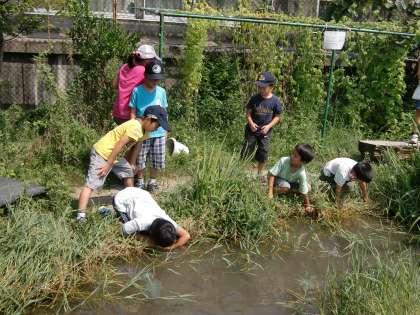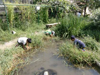 「こんな日はきっと…」と思ってビオトープの池へ行ってみると,思ったとおりです.思いっきり精悍さを増した1年生のZHG(ザリガニハンターグループ)が躍動していました。