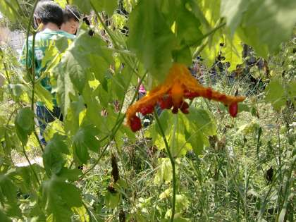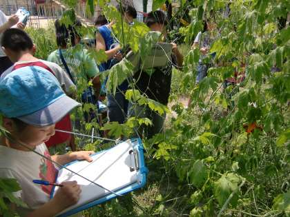 4年生がビオトープにツルレイシの観察に来ています。