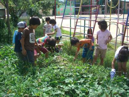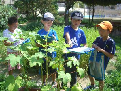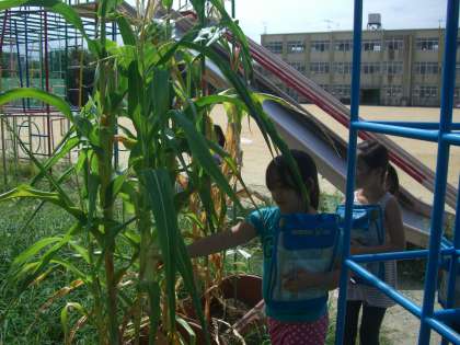 夏休み中もみんなで頑張ってお世話をした野菜が大きく育っています。さつまいもやポップコーンは,秋に収穫する予定です。子どもたちは,「夏休み前よりだいぶ大きくなったなぁ!!」と驚いた様子でした。
