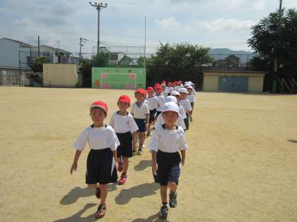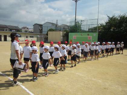 9月28日の運動会を目指して今日から練習を始めました。らいおんチームは白組で,きりんチームは赤組です。暑い中,入場行進の練習をしました。