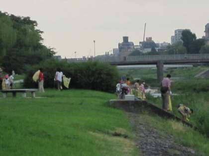 鴨川につくと、さっそくゴミを集めます。鴨川の道には、思ったほどゴミは落ちていません。ゴミがあるのは、川の中や岸のあたらいにたくさんあります。親子で楽しくゴミを集めてくださいました。
