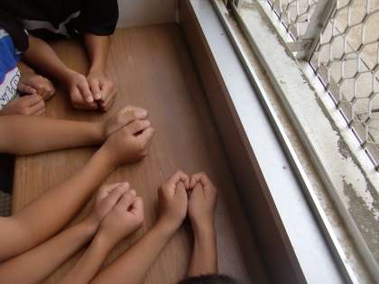 いくつかの人のかたまりができています。その中の一つが両手の指を使ってゲームをしていました。遊び方は私にはよく分かりませんが,これなら何も職員室前の廊下まで出向かなくてもいいですよね。