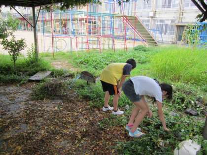まず、せせらぎのあたりの雑草、せせらぎから池にいくところの雑草を抜いていただきました。ビオトープの掃除当番の6年生も参加してくれました。