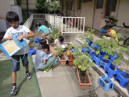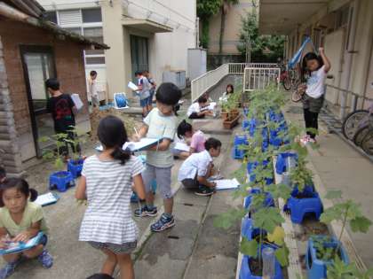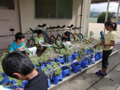 体育館の南側に並べたオクラの鉢,ホウセンカの鉢の前でスケッチです。四錦の子はこのような観察記録のスケッチをとても丁寧に描く子が多く感心しています。