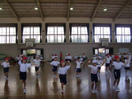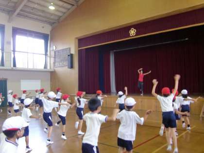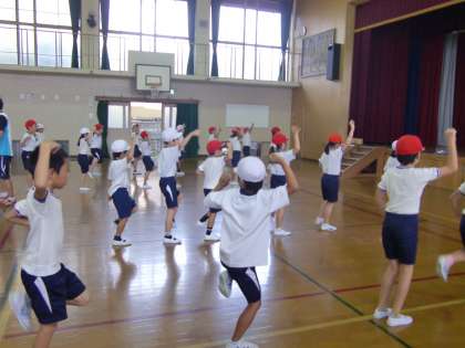 体育館で2年生が運動会で披露するダンスの練習をしています。まだ,練習初期の段階ですから振付けを覚えるのに精いっぱいで細かいところまでは気は回せませんが,迫力は十分です。