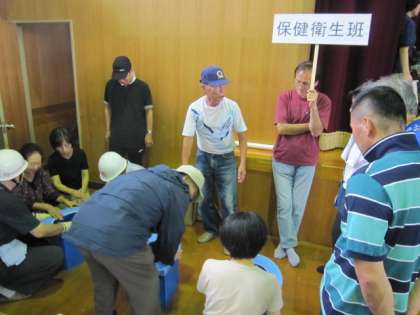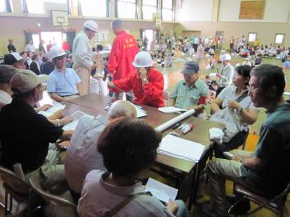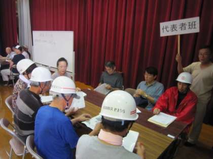 代表者班や情報班は、ペットの持ち込みや名簿作りなどについて、さっそく話し合いをもたれました。衛生班は、簡易のトイレの組み立てなど、それぞれの係が実際に必要な場面を想定されていました。