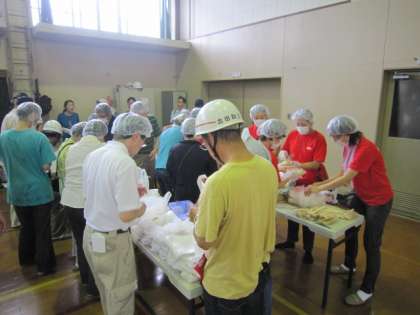 食糧班のみなさんは、実際にそれぞれの人数分を入れ物に詰めていかなければなりません。たくさんの人数で、大変素早く作業されて、あっという間にすべてのご飯を詰め終わられました。PTAの赤シャツが、ここでも大変目立っていました。