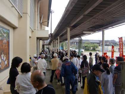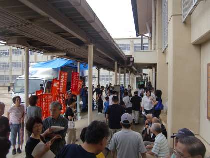 写真は雨の中を町内ごとに四錦まで避難してこられた方々です。体育館の外の渡り廊下で開場待ちをしておられるところです。