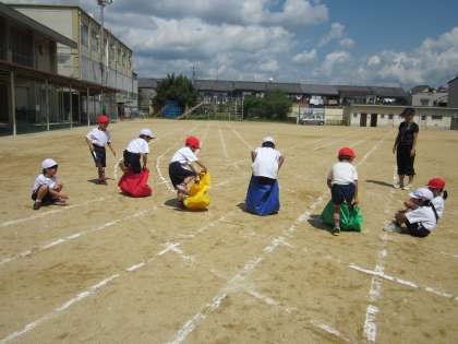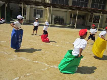 ホップサックの中に素早く入り,ジャンプ!ジャンプ!ジャンプ!