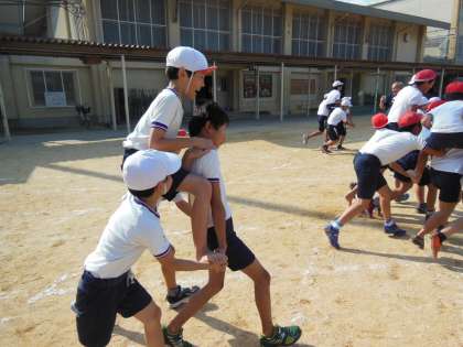 騎馬の状態で走ってみるとなかなかうまくいきません。それぞれが思いやり,みんなの気持ちを一つにしていくことがとても大切です。これからも練習をしていく中で,本当の支え合いや思いやる気持ち,協力することについて考えられるように子どもたちと一緒に取り組んでいきたいと思います。