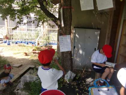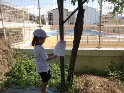 環境委員会が行っている『クイズラリー』です。多くの子どもたちが回答用紙を手に問題に挑戦しています。私に答を教えてとせがんでくる子もいます。