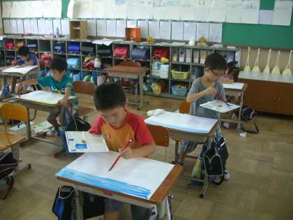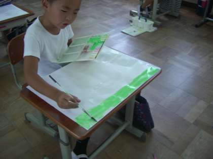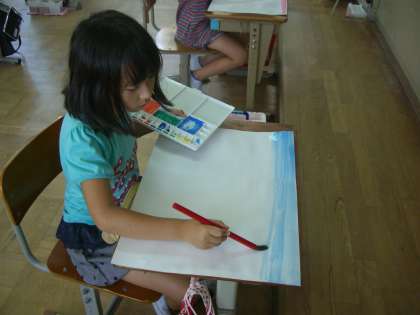 「おはなしの絵」を描くために世界で一つの色画用紙作りをしました。自分の描きたい場面にぴったりの色を作って,画用紙に塗っていきます。筆の使い方もなかなか上手になってきました。どんな絵ができあがるか今から楽しみです。